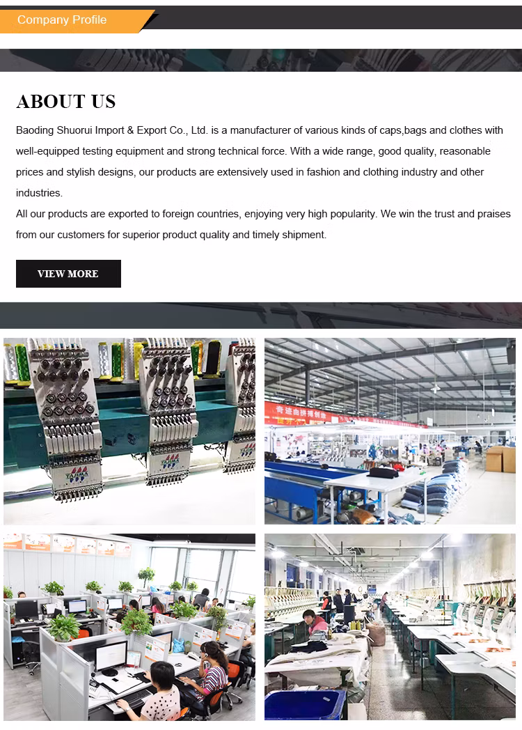 Baoding Shuorui Import & Export Co, Ltd. È un produttore di vari tipi di tappi, borse e vestiti con attrezzature di prova ben attrezzate e forte forza tecnica. Con una vasta gamma, buona qualità, prezzi ragionevoli e design elegante, i nostri prodotti sono ampiamente utilizzati nell'industria della moda e dell'abbigliamento e in altri settori.